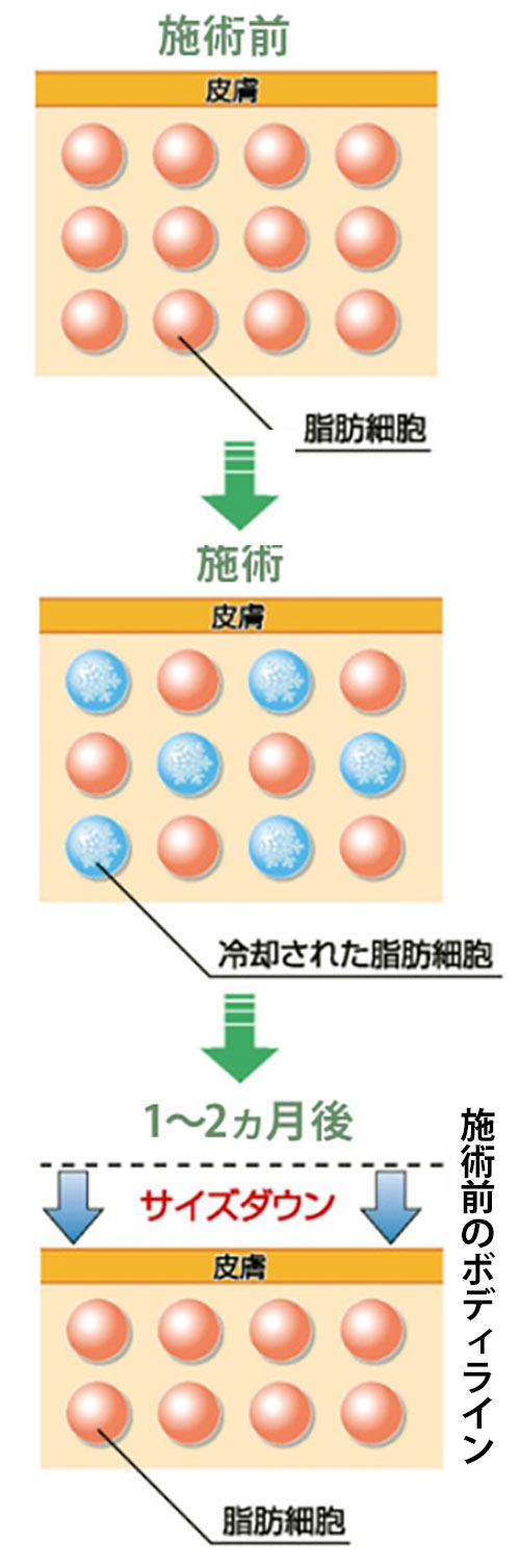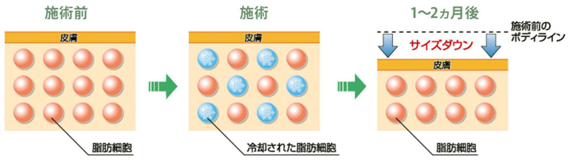 人間の身体は約60%以上が水分でできています。水分は0度以下で凍りますが、脂肪は4度で凍り始めます。その差を利用し、脂肪のみを凍らせて脂肪細胞にダメージを与えると、その細胞は老廃物として約4週間で体外に排出されます。脂肪細胞のみを狙ってダメージを与えるため、皮膚や血管など周辺組織に影響なく、痩身効果が期待できるという技術です。